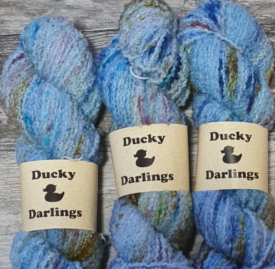 In a variegated shades of blues with flashes of multicolours .